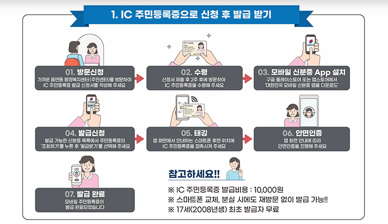 - 수령: 신청서 제출 후 주민센터에서 IC 주민등록증을 수령합니다.