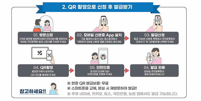 - 발급 신청: 주민등록증을 조작 가능한 상태로 두고 QR 촬영 방식을 선택합니다.